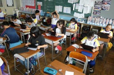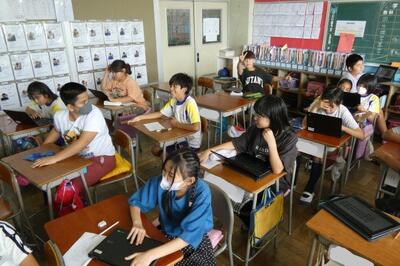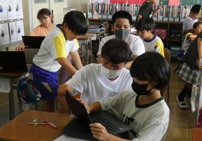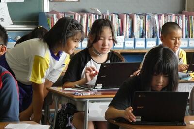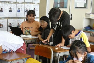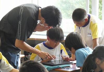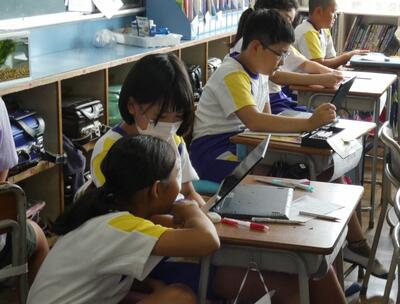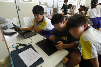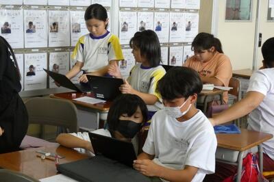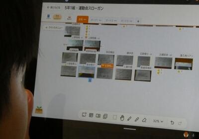 今年の運動会は、創立50周年という大きな節目の催しです。子供たちは、どんなキーワードを盛り込んだらいいか、どんな表現だったら自分たちの思いや描いているイメージが伝わるか、画面を食い入るように見つめたり友達とおしゃべりしたりしながら、考えていました。