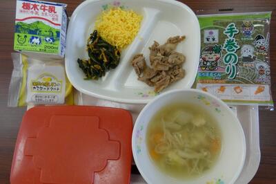 今日は、大内中学校リクエスト給食でした。キンパ風手巻きずし(焼肉・ナムル・錦糸卵・手巻きのり・ごはん)、秋のみそ汁、瀬戸内産レモンのカスタードタルト、牛乳をいただきました。エネルギー759kcal、たんぱく質27.4g、脂質28.9gでした。ごちそうさまでした。