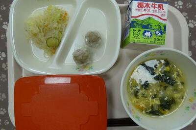 今日の給食は、ポークしゅうまい、春雨サラダ、中華風コーンスープ、ごはん、牛乳でした。エネルギー584kcal、たんぱく質21.3g、脂質15.7gでした。ごちそうさまでした。