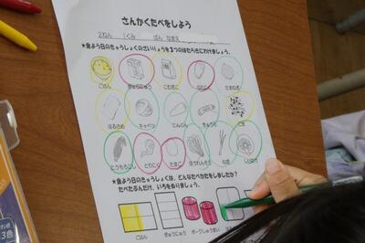 子供たちは講師の先生から、栄養の3要素(赤・黄・緑)をバランスよく食べることの大切さを学んでいました。