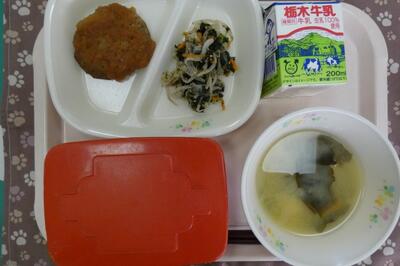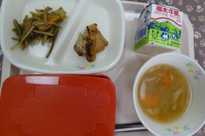 今日の給食は、とり肉のみそマヨネーズ焼き、五目きんぴら、ひっつみ汁、ごはん、牛乳でした。エネルギー631kcal、たんぱく質27.1g、脂質17.4gでした。ごちそうさまでした。
