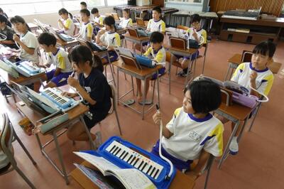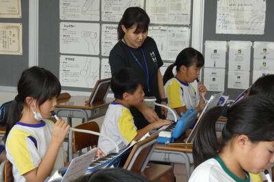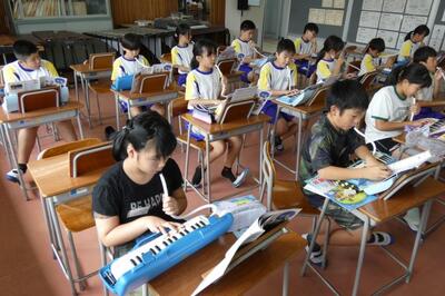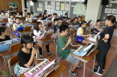 練習の後、全員で曲に合わせて演奏してみると、和音の良い響きが流れました。先生が「いい感じ!」と拍手。子供たちもとても満足そうでした。