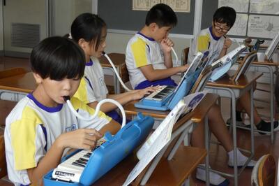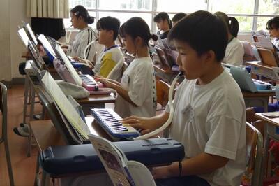 5年4組の音楽科の授業におジャマしました。ソプラノリコーダーでフォスター作曲の「静かにねむれ」を演奏しました。