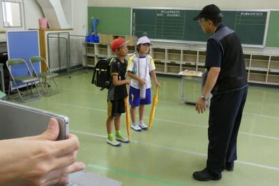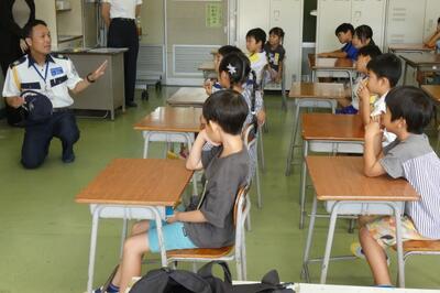 警察スクールサポーターを講師にお迎えして、登下校時に不審者に遭った時の対応について学びました。2年生の児童がモデルとなり、一般の児童はオンラインで参加しました。