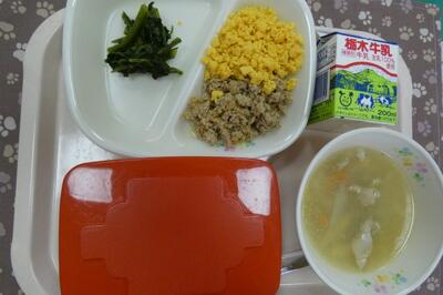 今日は「地産地消給食」でした。三色ごはん(鶏そぼろ・卵そぼろ・ほうれん草)、根菜のごま汁、牛乳をいただきました。エネルギー673kcal、たんぱく質28.0g、脂質24.9gでした。ごちそうさまでした。