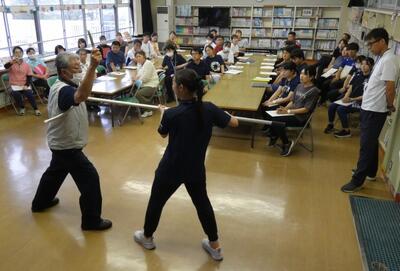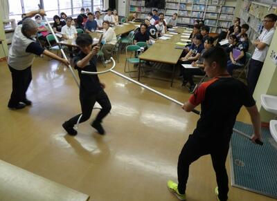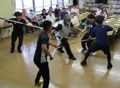 児童の下校後、職員研修の一環として、さすまたの効果的な使用法について勉強会を行いました。