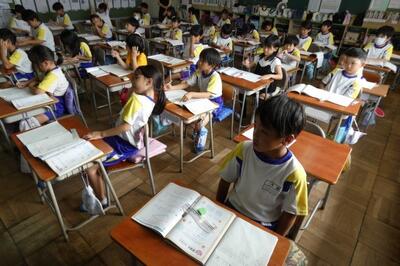 教師の指示で、教室のドアにバリケードを作る子供たち。