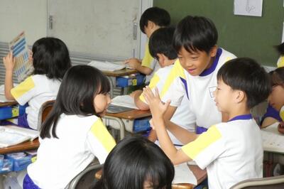 今年の運動会の種目の話題で盛り上がる子供たち。