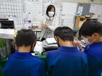 5年生は初めてのお裁縫、玉結びに挑戦していました。「難しいよ~。」「指が思うように動かない!」「誰か助けて~。」なんて声も聞こえてきました。