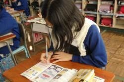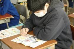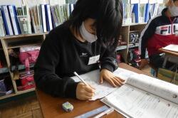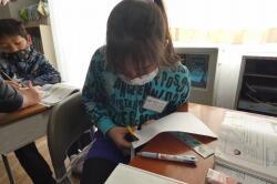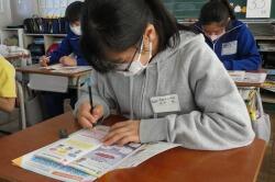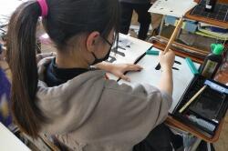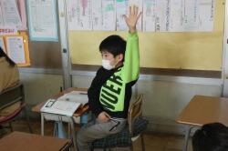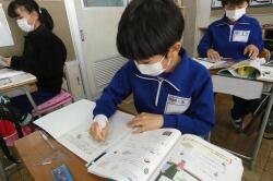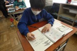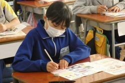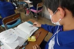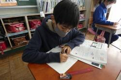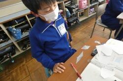 はさみで紙を切っていますが図工ではなさそうです(5年)