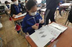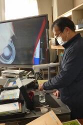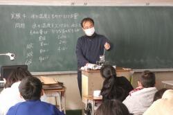 まん延防止重点措置が出ているため、理科室で実験ができません。そこで、教室で教師が演示実験を行っています。