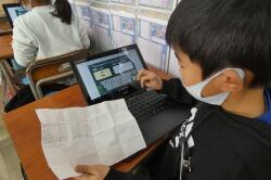 係りの仕事で学級新聞を作っています、タブレットで!コロナ対策のため、必要がないときは自分の席に座っている子供たちでした。