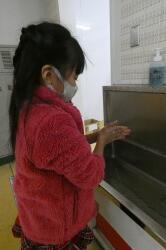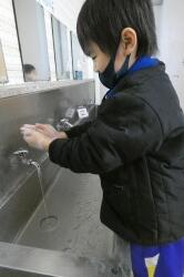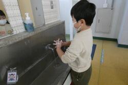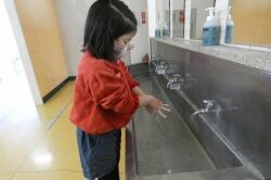 休み時間に1年生の廊下にいたところ、トイレから出てきた児童が石鹸で手を洗い始めました。
