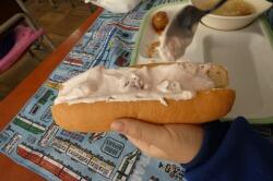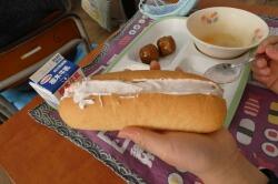 「いただきます」の後、今日の献立「フルーツクリームサンド」を作ります。