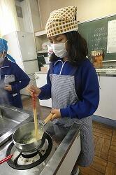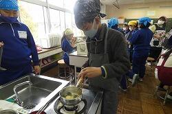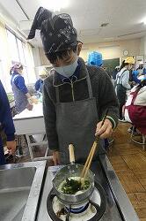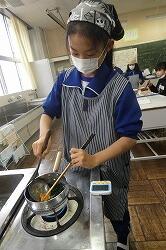 家庭科の調理実習はセルフクッキング、一人調理です。わかめとふを具材に、各自が一人分の味噌汁を作っていました。
