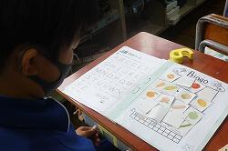 これらの対話を使ってビンゴをしていました。ビンゴの中身は果物・食べ物です。