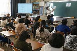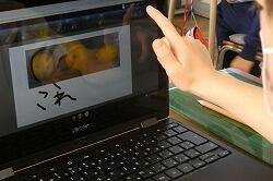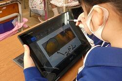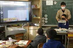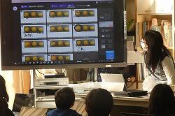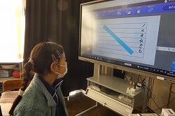 グループでの活動を終え、今度は学級の全員で考えます。一人がノートを電子黒板に投影して説明します。
