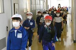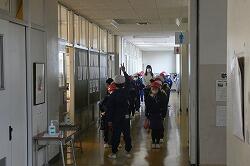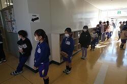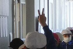 廊下に整列しており、先頭の児童が手を上に挙げ、「チョキ」を出しているのです。