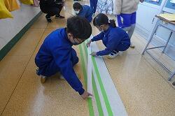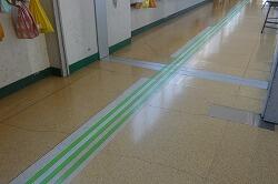 今朝3年生の廊下にテープで線が引かれていました。何のために線を引いたのか疑問でした。