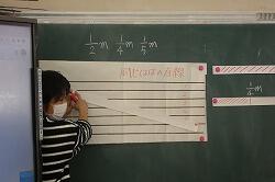 分子が1のとき、分母が大きくなるとテープの長さが短くなるということを書いていました。最後に先生に今日の授業の内容は4年生の内容だと聞かされ、自信を深めた3年生でした。
