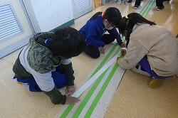 そして、自分たちで1/2、1/3、1/4、1/5、1/6を測っていきます。そのときに廊下の線を使うのです。