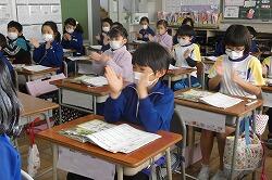 新型コロナウイルスやインフルエンザ、O-157などからの感染を防ぐためには手をきれいにすることが必要です。1年生が手をきれいにするコツを保健室の先生から教えてもらいました。