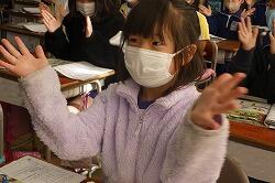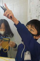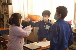 休み時間、2年生の廊下で「チョキ」を出している児童がいました。でも、じゃんけんではありません。