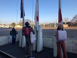 今朝登校時の気温は0℃。旗揚げ当番の児童は手がかじかんでいますが、国旗、市旗、校旗を揚げています。