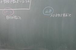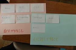 同じような意見はまとめました。今度はそれらについて個人がすることなのか、他の人に対してすることなのかを分類します。自分がすることはピンクの色画用紙に、他の人に対してすることは水色の色画用紙に貼ります。