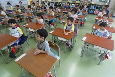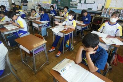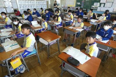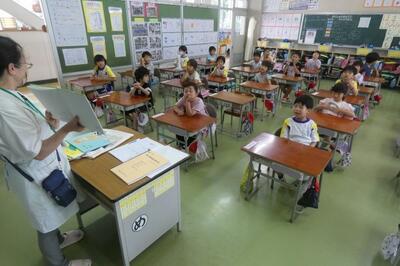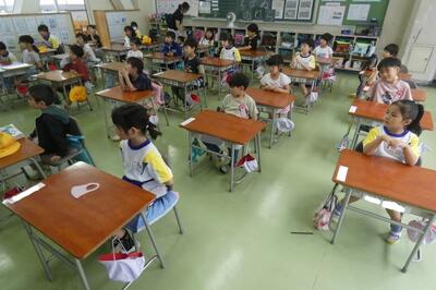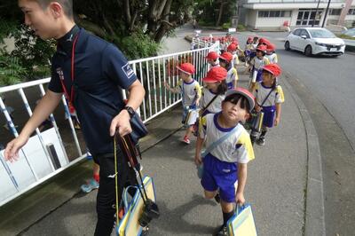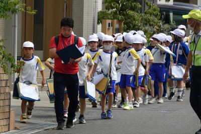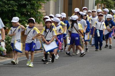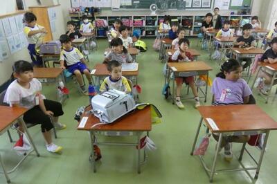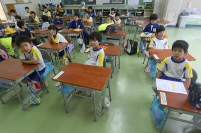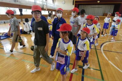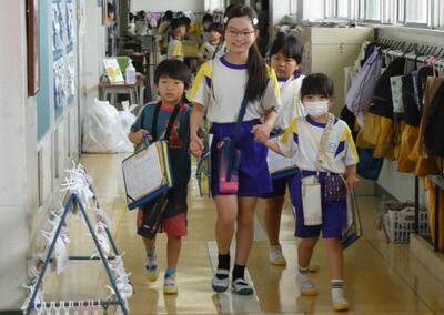 自教室から「なかよし班」に移動する子供たち。6年生が1年生を迎えに行ってくれました。
