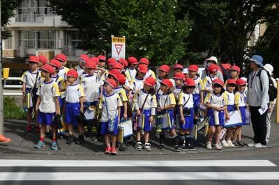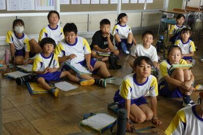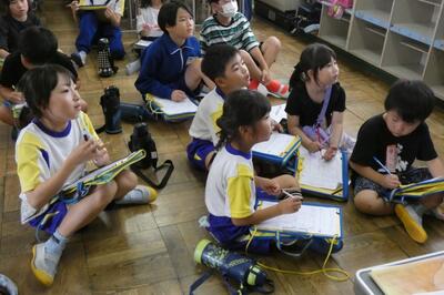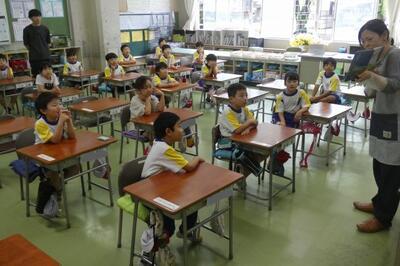 先生の笛の合図で話を止めて静かに聞くよう、子供たちには繰り返し指導しています。