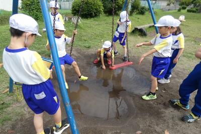 次に、お隣の友達と水をかけっこしたり、バタ足をしたりした後、・・・