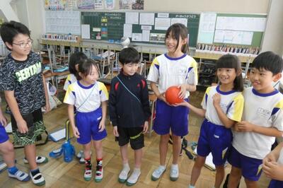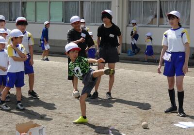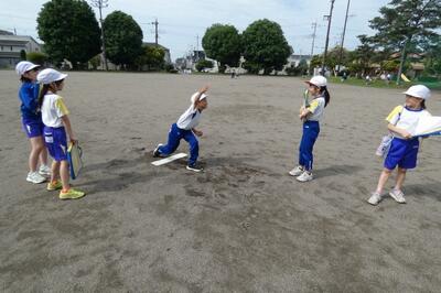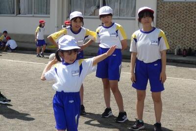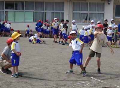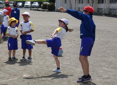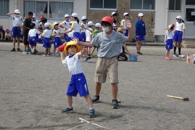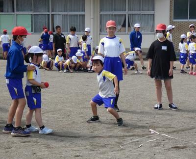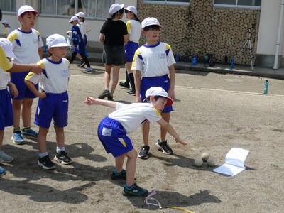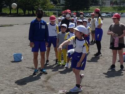 校庭ではボール投げを行いました。ソフトボールを投げる前に、6年生に教わりながら赤白玉を投げました。
