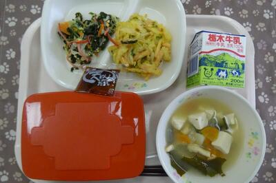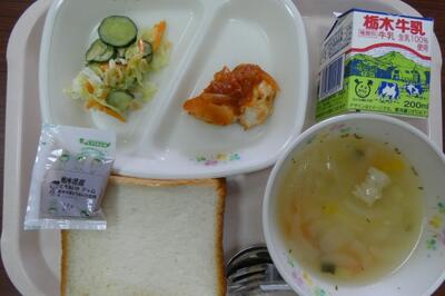 「地産地消週間」最終日です。今日は、ぎょうざの甘酢あんかけ、かんぴょうサラダ、ゆば入りみそ汁、ごはん、牛乳をいただきました。エネルギー655kcal、たんぱく質20.5g、脂質22.6gでした。ごちそうさまでした。
