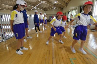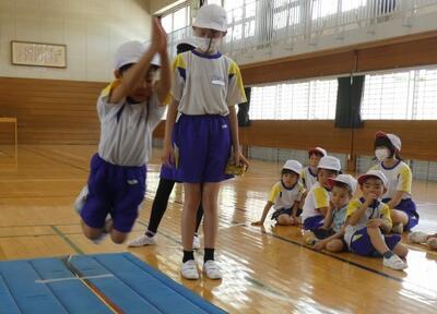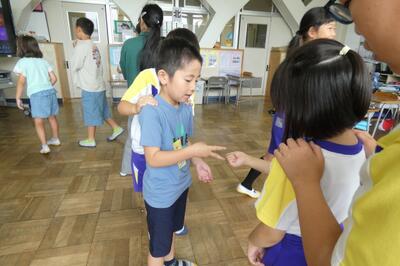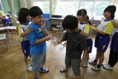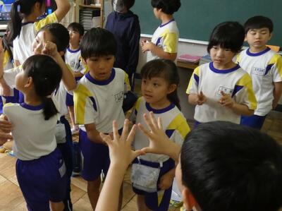 始めに、ジェスチャー、ダンスを交えて、みんなで英語の発話や歌を楽しみました。