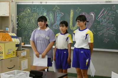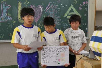 スタートは「委員会紹介&クイズ」。児童会委員会ごとに、活動紹介や皆さんへのお願いを伝えた後、クイズを出しました。(児童会室からの生放送です。子供たちはカメラに向かって話しています。)
