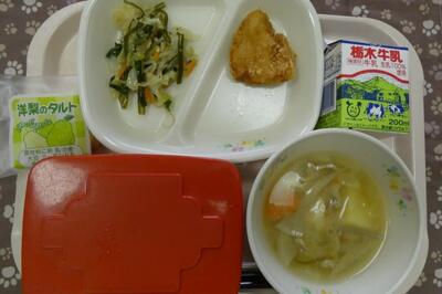 今日は、大内東小学校リクエスト給食でした。とりのから揚げ、茎わかめのナムル、豚汁、洋梨のタルト、わかめごはん、牛乳をいただきました。エネルギー746kcal、たんぱく質24.5g、脂質27.0gでした。ごちそうさまでした。