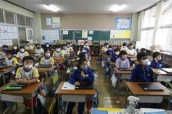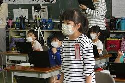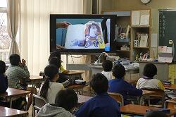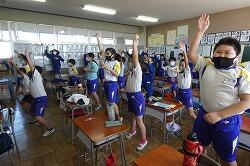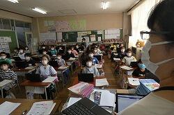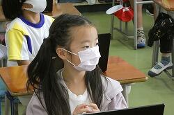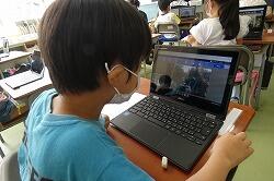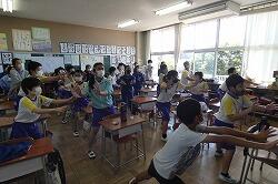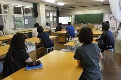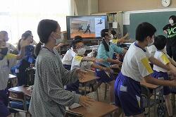 5年生が体育の授業で西小よさこいソーランを練習します。今日は教室でビデオを見ながら振付を覚えます。