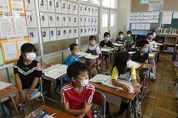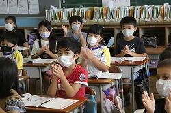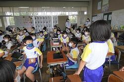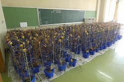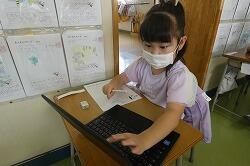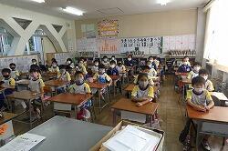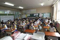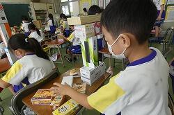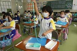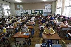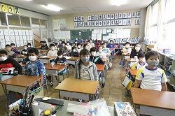 南校庭で体育の授業をしている1年生の教室には誰もいません。その教室の机の上にあるものが置かれていました。