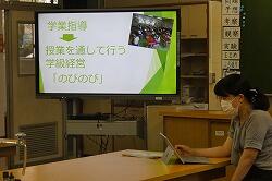 今日の研修は第1学年主任を講師に、学業指導についてです。県教育委員会が提唱している学業指導に基づいて、学級経営をどのように行っているか、その工夫を紹介してくれました。