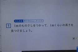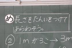 紙テープを持ち、どこかへ行こうとしています。話を聞くと、算数の授業で南校庭に行き、1mの紙テープを使って1m程度の物を図るそうです。教室の黒板を見ると、このようになっていました。