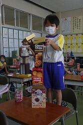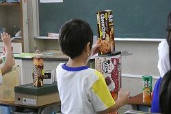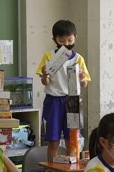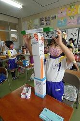 いろいろな形の箱を高く積み上げます(1年・図工)