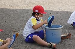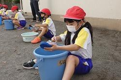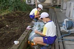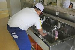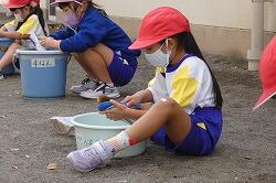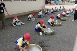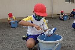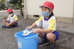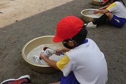 1年生が生活科で上履き洗いを行いました。洗剤をつけてゴシゴシこすります。