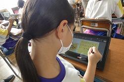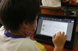 タブレットで場面絵を提示し、その場面に応じた言葉を書いていきます。