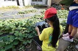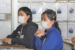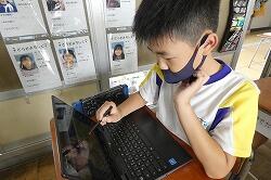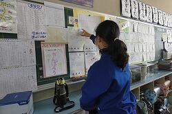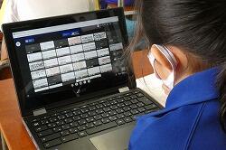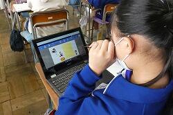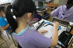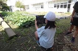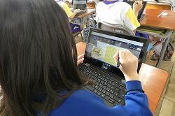 教師が前もって準備した校内の掲示物などの写真をタブレットで見て、漢字を探し、ワークシートに書く活動です。