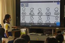 教師用のタブレットで児童の画面を電子黒板に提示し、友達の結果を見ます。