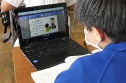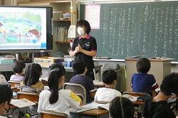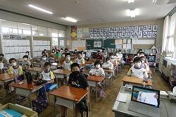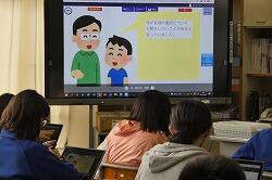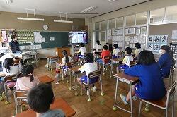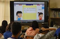 1年生の道徳科を参観しました。今日は教材の場面絵をタブレットに提示し、子供たちはそれを見ながら話を聞きました。
