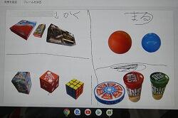子供たちが持ってきたいろいろな形の箱を分類することが今日のねらいです。主に丸と四角に分けます。タブレットには先生からいろいろな形の写真が送られてきており、タブレット上でそれを動かし分類するのです。