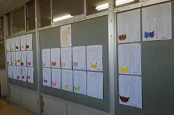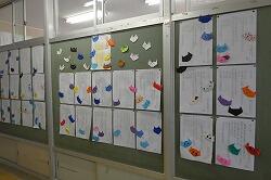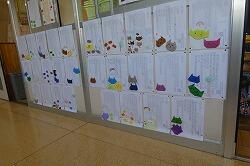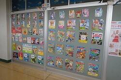 学校図書館に新しい本が入りました。廊下にはカバーが掲示されています。