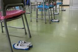 金曜日に生活科で洗った上履きが机の下に置かれています。